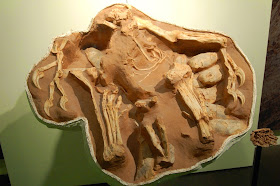 So what exactly can we gather from this Citipati fossil?  Like I stated before, upon looking inside some of the eggs, and by comparing them to other eggs that have been found in the area, it was concluded that Citipati and its kin were caring parents and totally undeserving of their "egg thief" name.  (Although they may have eaten the eggs of other dinosaurs too even though no evidence suggests it as of now...eggs are nutritious!)  It also solidified the modern bird's connection to other dinosaurs thanks to the pose this parent had died in.  The last bit of information wasn't so obvious.  If you look at the fossil, you will notice that the parent's body with the arms out to the sides still doesn't completely cover the eggs as it is.  If it had arm feathers, however, all the eggs would have been perfectly guarded under a nice, plumed roof...just like modern birds.  This fossil, even though no actual feathers were preserved, brought us that much closer to the eventual realization that many theropod dinosaurs had feathers in life.
